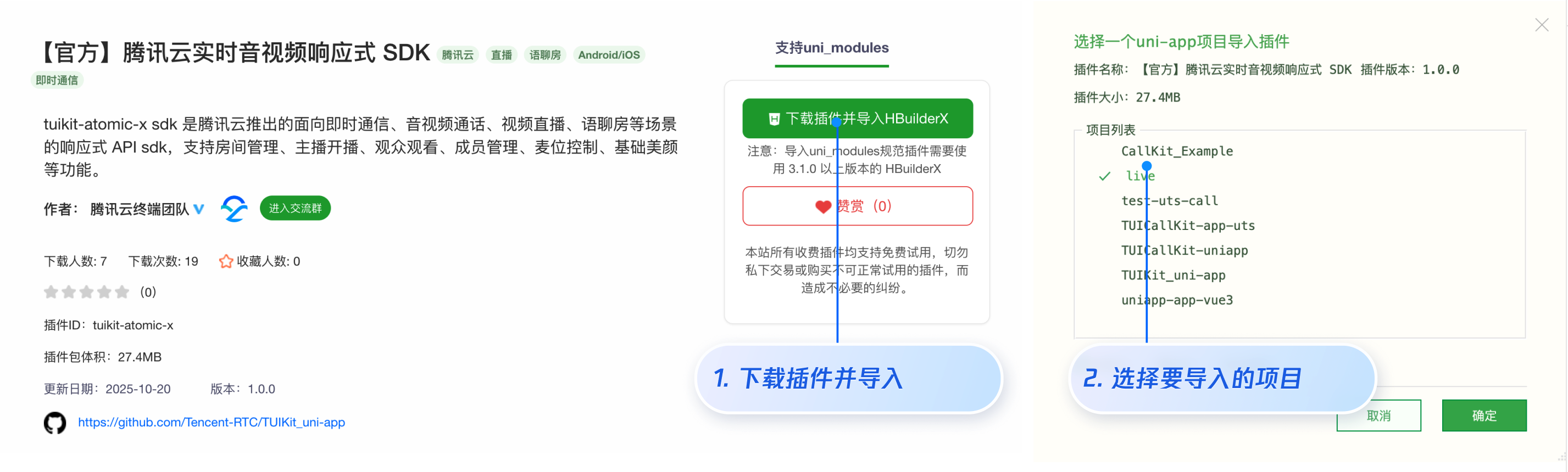 1. 安装组件:打开 AtomicXCore SDK,单击下载插件并导入 HBuilderX,选择需要集成的项目并单击确定。