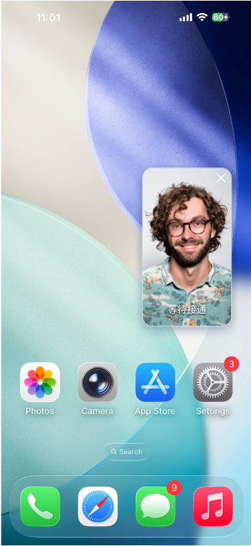 布局逻辑:呼叫等待时全屏显示己方画面;接通后全屏显示对方画面,己方画面以悬浮小窗展示。 交互特性:支持小窗拖拽移动,点击小窗可实现大小画面互换。 | 布局逻辑:所有成员画面呈网格状平铺排列成宫格模式布局,适用 2 人以上通话,支持点击放大画面功能。 交互特性:支持点击特定成员画面放大查看。 | 布局逻辑:1 v 1 场景固定显示对方画面,多人场景:采用当前发言者(Active Speaker) 策略,自动识别并全屏展示正在说话的用户。 交互特性:等待时显示自己的画面,接通后还会显示通话计时。 |