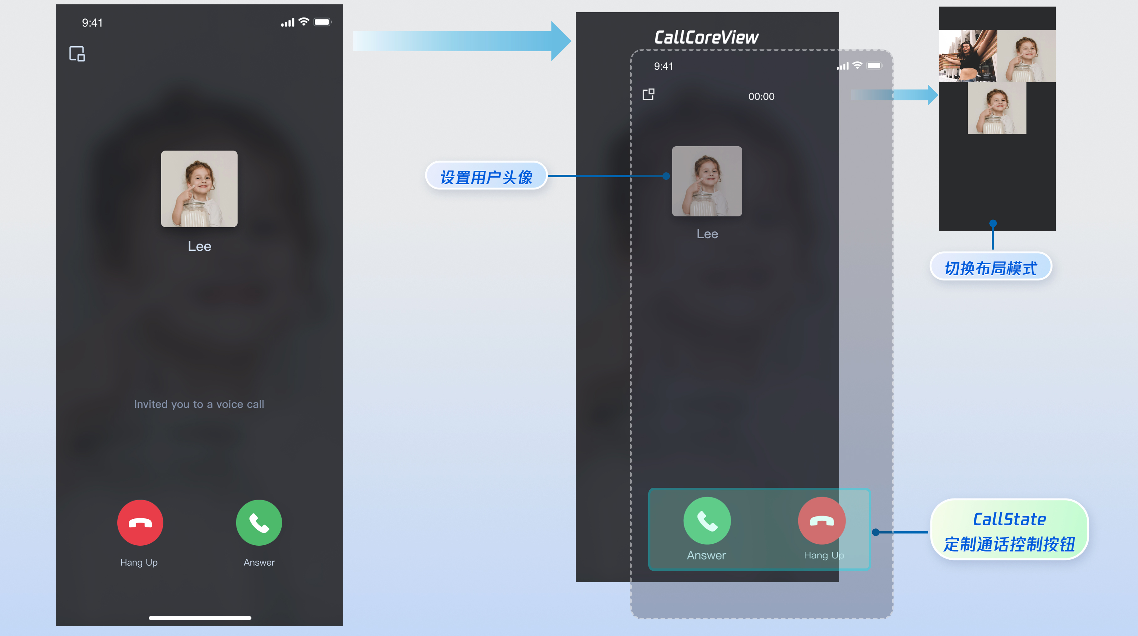 2. 通话页面绑定 CallCoreView:通话视图核心组件,自动监听 CallState 数据并完成画面渲染,同时提供布局切换、头像与图标配置等 UI 定制化能力。