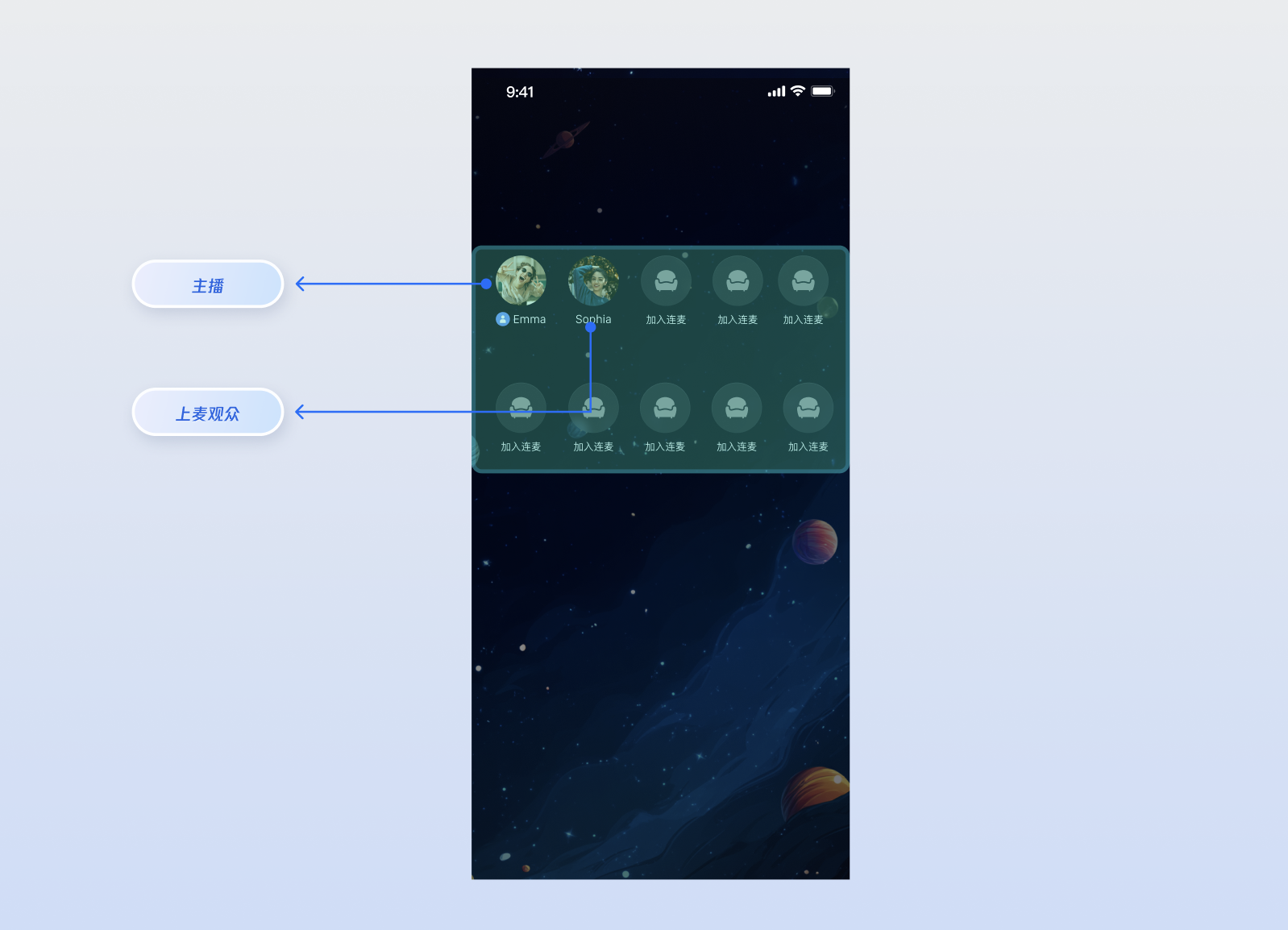 LiveCoreView 作为核心组件来渲染主播和连麦观众的视频流。UI 的重点是处理视频画面的布局、大小,以及通过 在视频流上添加挂件(例如昵称、占位图)。您可以同时打开摄像头,麦克风。语音房(语聊房):核心是麦位网格。您不会使用