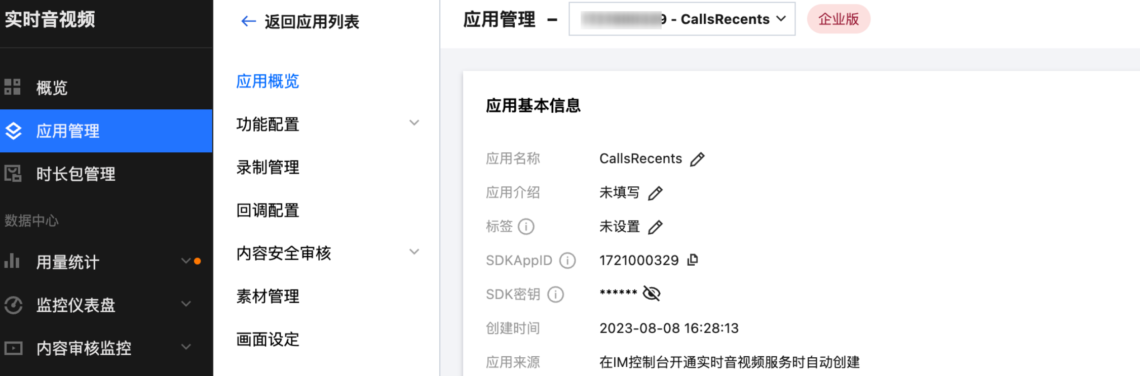 单击您需查看的 SDKAppID 对应的应用信息,单击进入应用概览。