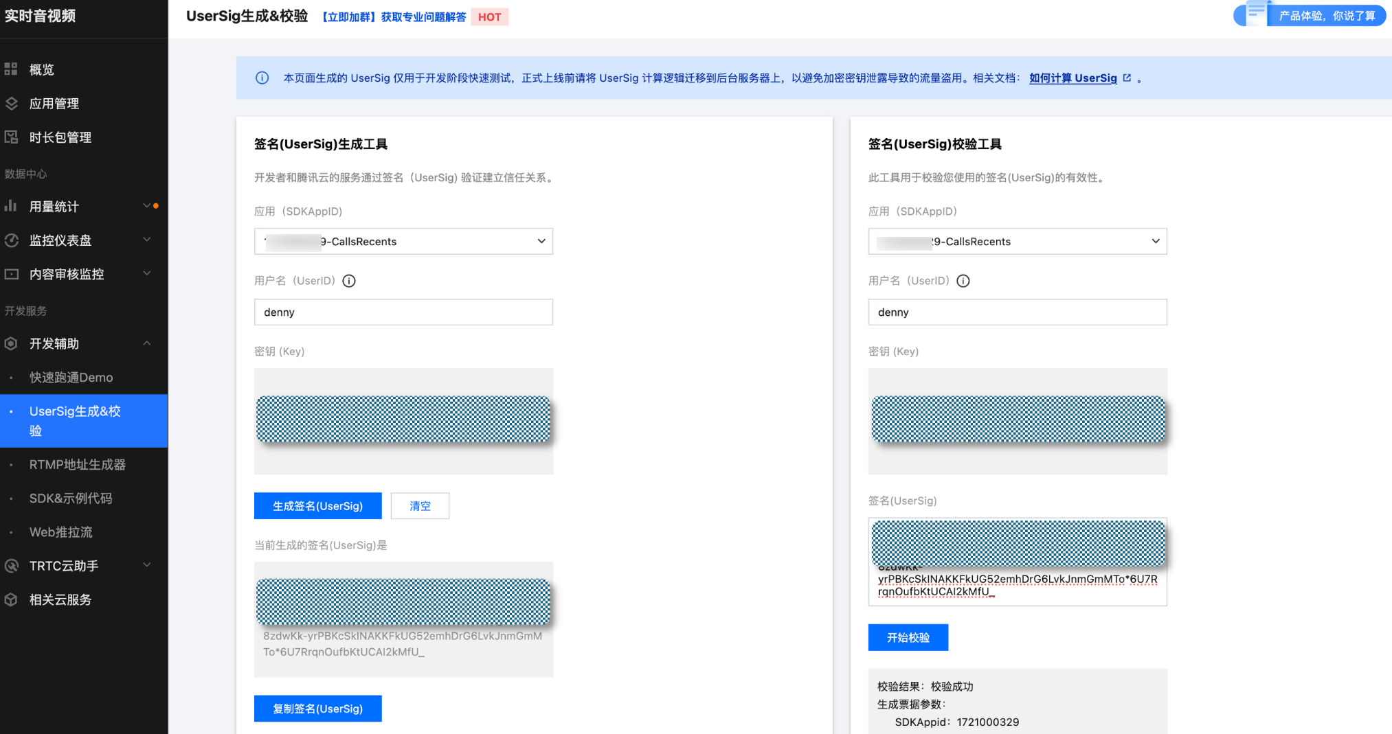 登录实时音视频控制台,进入开发辅助 > UserSig生成&校验。