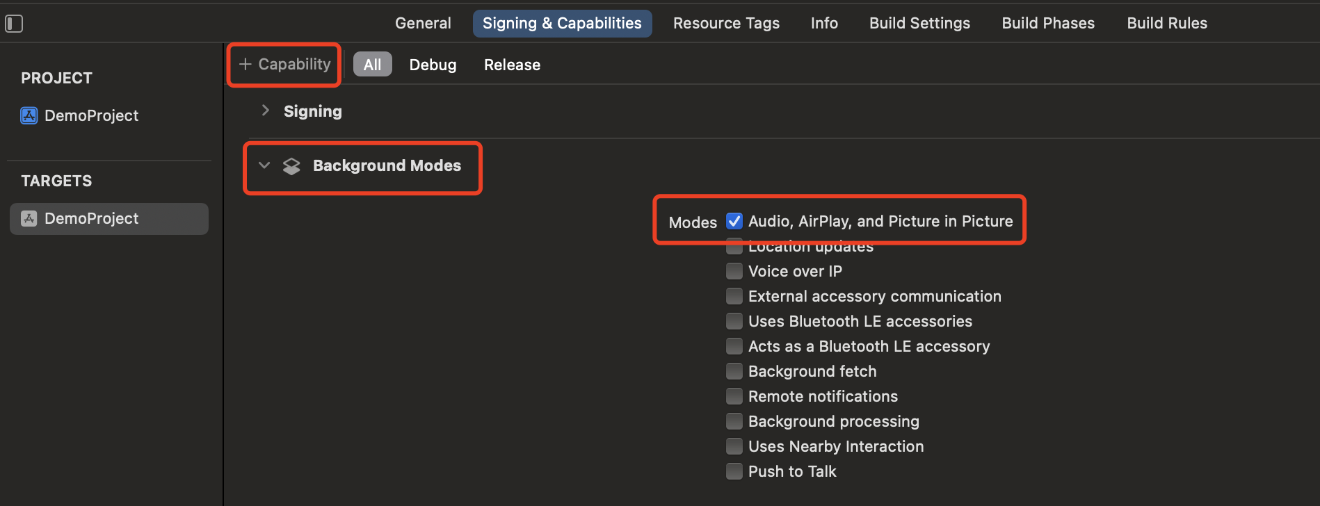 支持,如需要进入后台仍然运行相关功能,可选中当前工程项目,在 Capabilities 下的 Background Modes 模块中勾选 Audio,AirPlay, and Picture in Picture ,如下图所示: