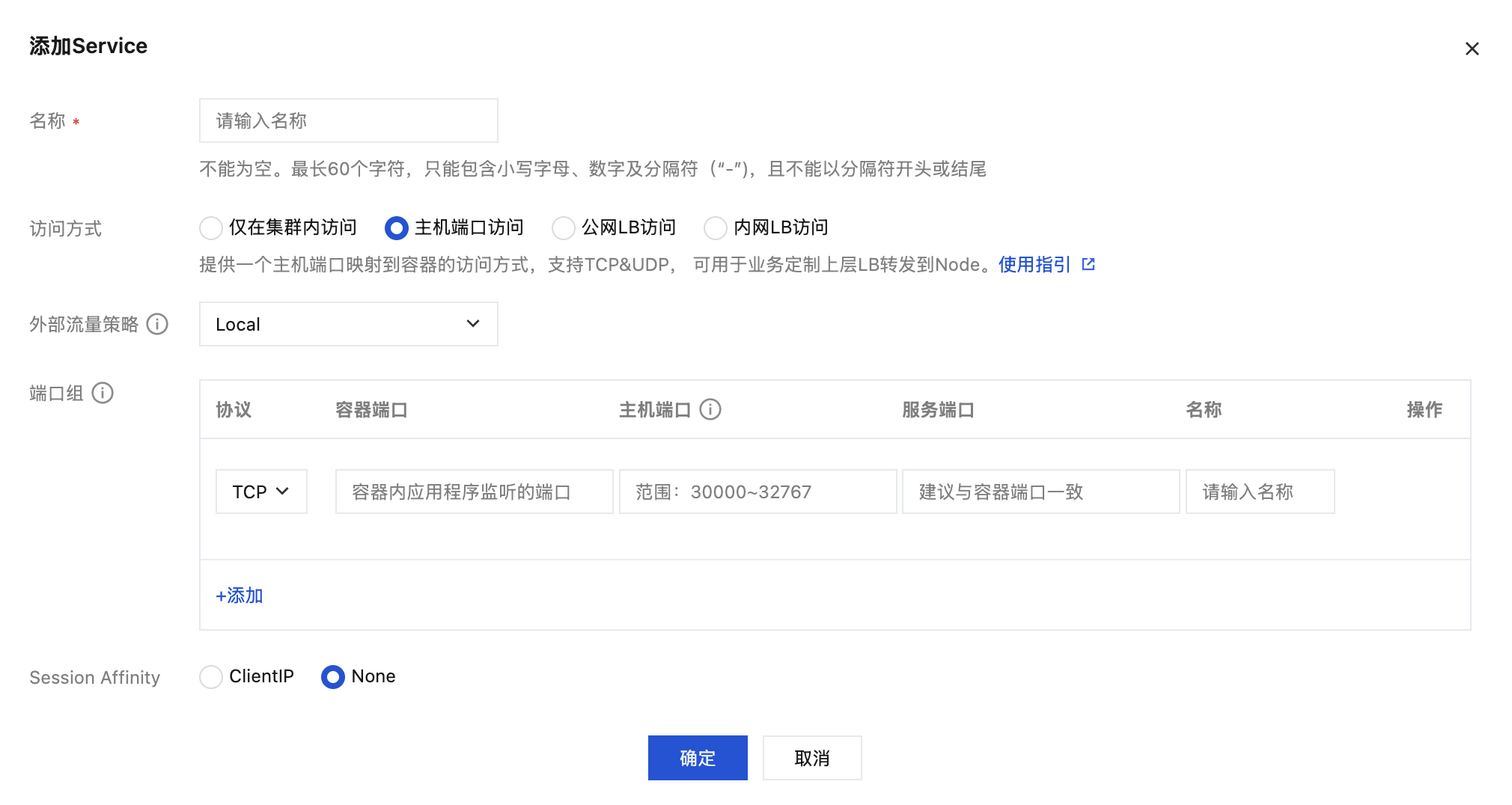 访问配置: 单击添加Service,按以下方法配置完成后单击确定,完成 Service 配置。