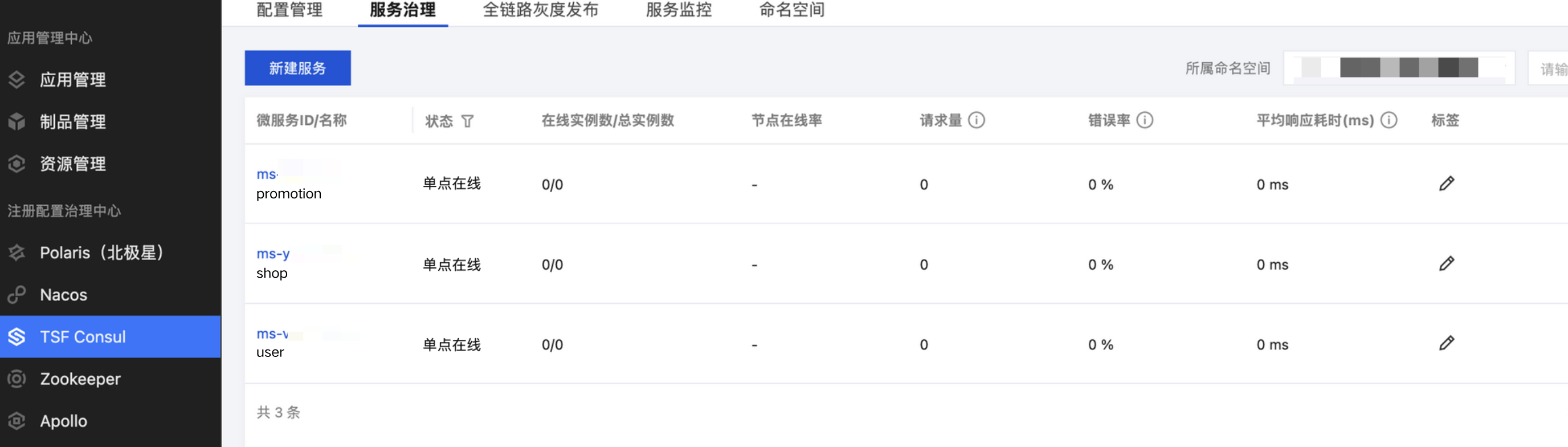 1. 前往 TSF Consul, 在服务治理页面,选择创建集群和命名空间后,可以看到 user、shop 和 promotion 服务的运行状况。服务状态为在线或单点在线,表示服务被代理注册成功。如果服务提供者的请求量大于0,请求错误率为0%,表示服务提供者被服务消费者请求成功。