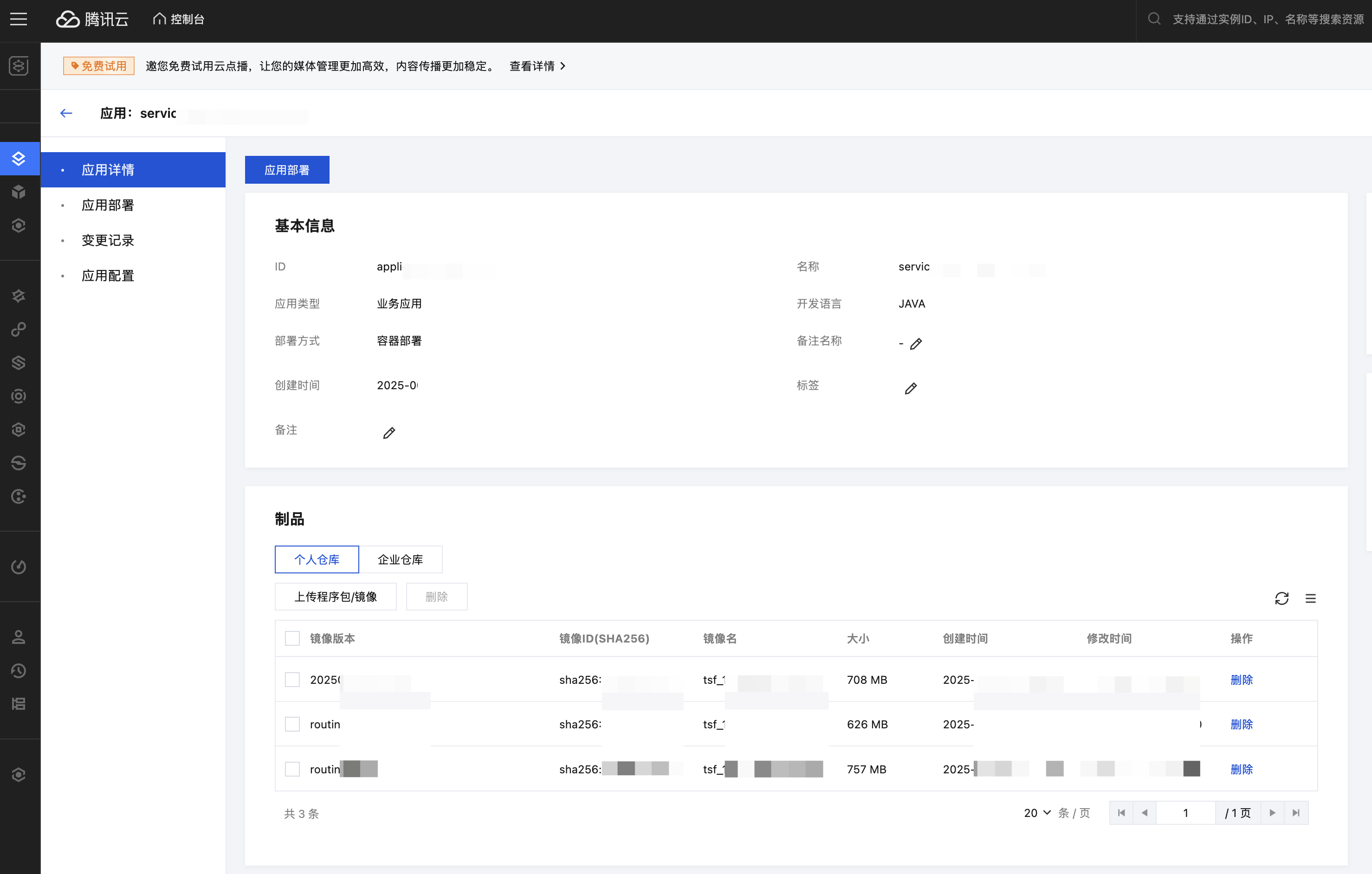 8. 应用部署成功后,重新进入主页单击应用管理, 单击对应的应用 ID,进入应用详情页,单击左侧导航栏的应用部署 > 部署组,查看运行中/预期服务实例数的数值发生变化。