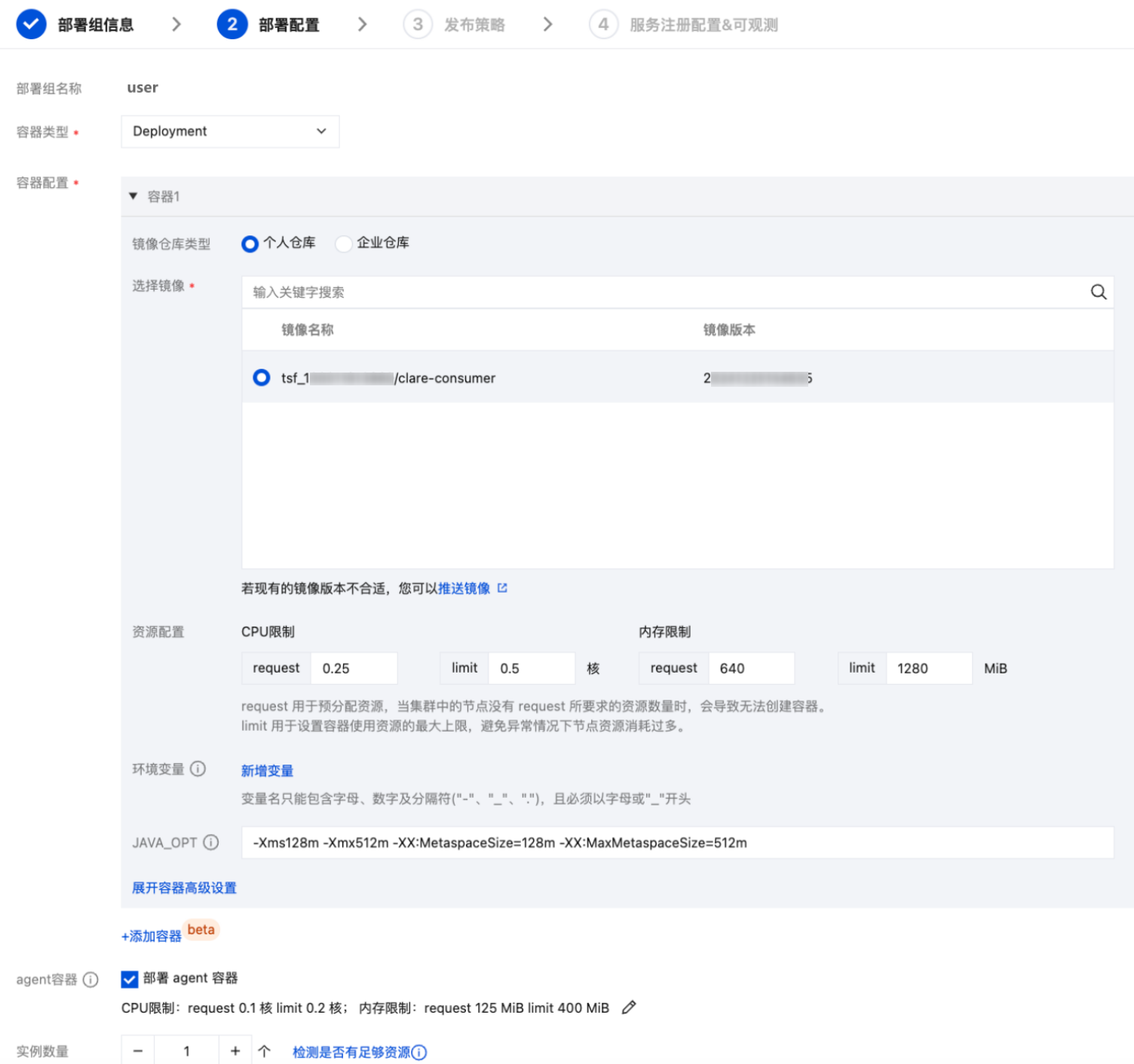 agent容器:默认勾选,用于采集日志,调用链,JVM 监控和弹性伸缩监控数据。