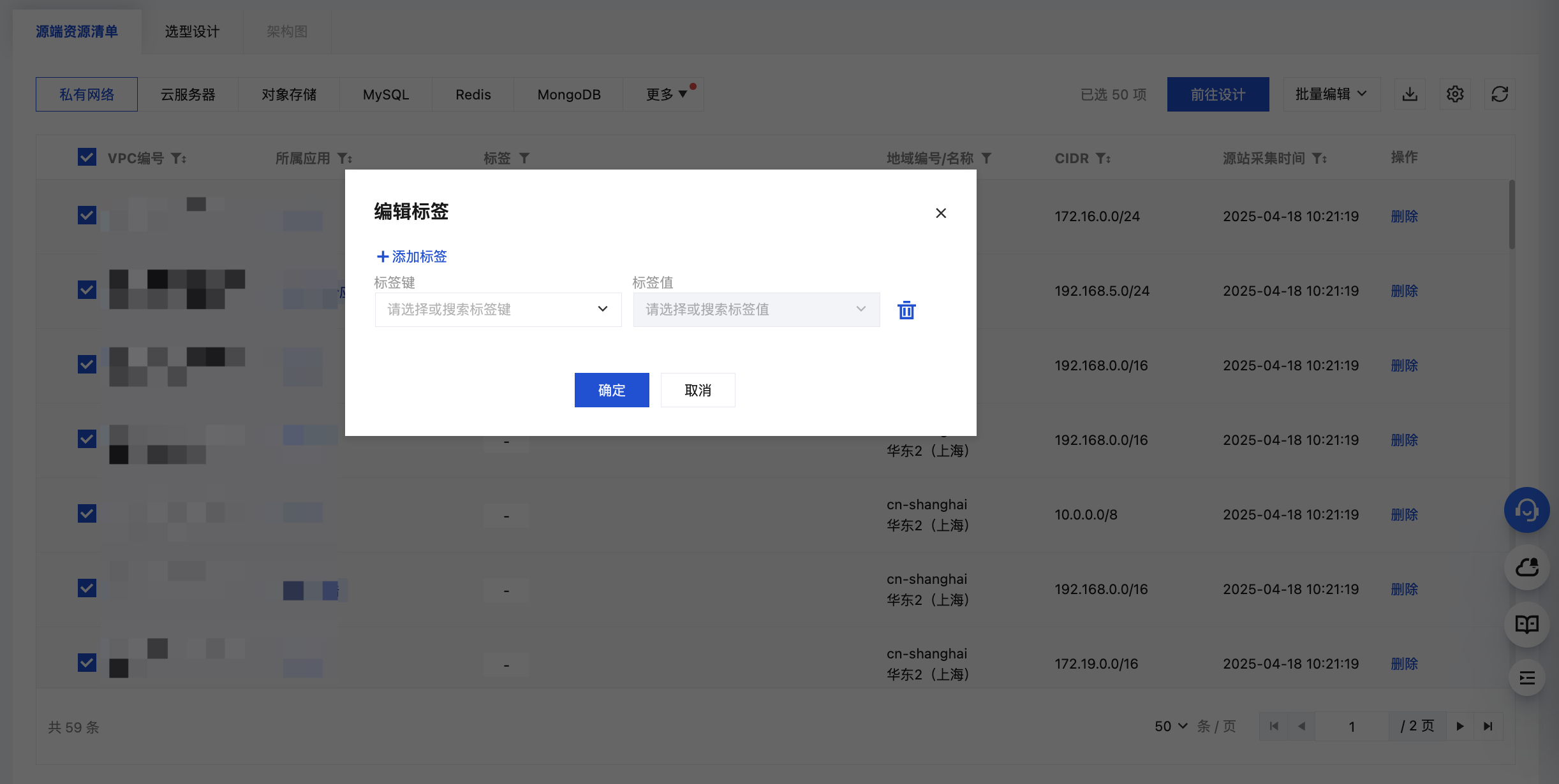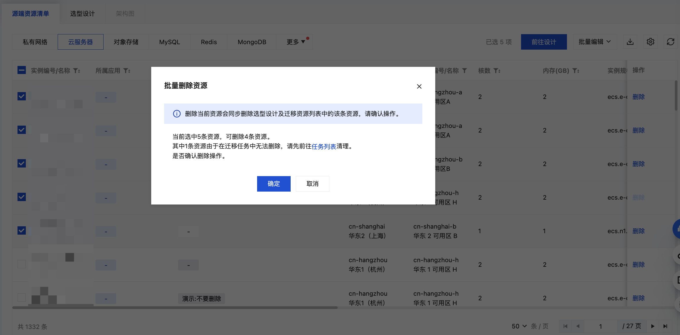 勾选资源后,选择批量编辑 > 删除,即可批量删除资源,删除当前资源会同步删除选型设计及迁移资源列表中的资源;已在迁移任务中的资源,无法删除,需先前往任务列表清理任务,再进行删除资源操作。