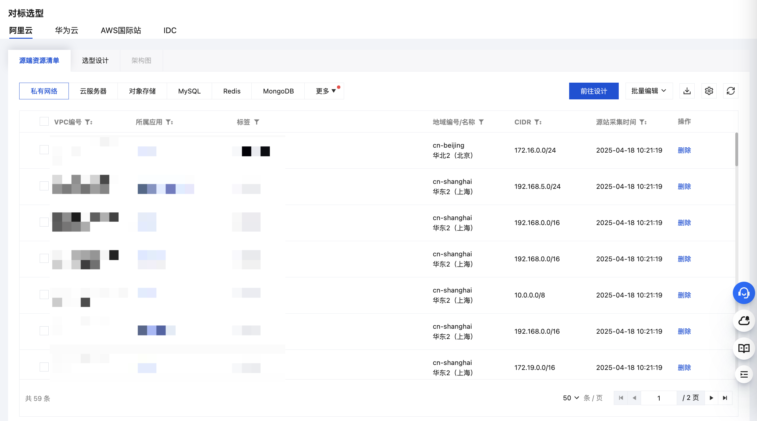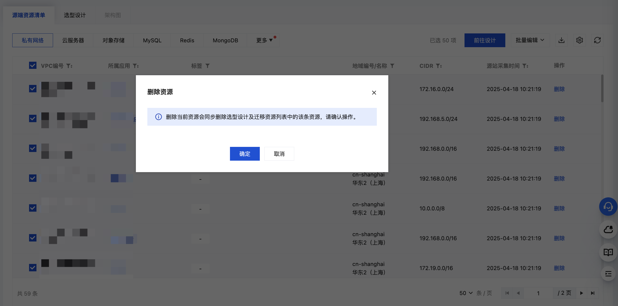 单击右侧删除按钮即可删除资源,删除当前资源会同步删除选型设计及迁移资源列表中的该条资源;已在迁移任务中的资源,无法删除,需先前往任务列表清理任务,再进行删除资源操作。