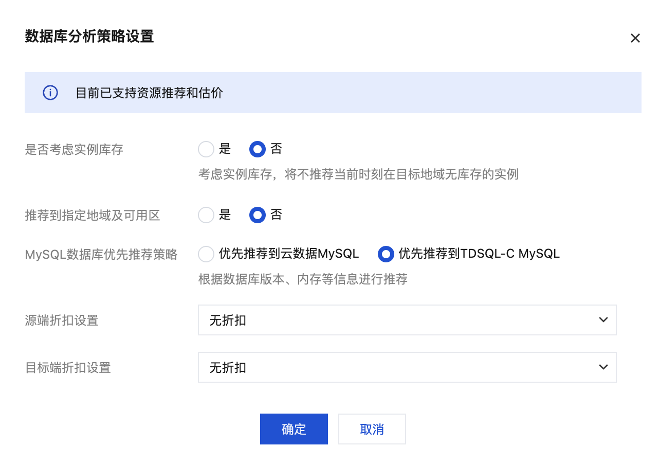 2. 选择产品的分析策略。如下图中,展示了数据库产品的分析策略选择,目前平台支持对是否考虑实例库存、推荐到指定地域及可用区、MySQL 数据库优先推荐策略三种推荐策略设置。