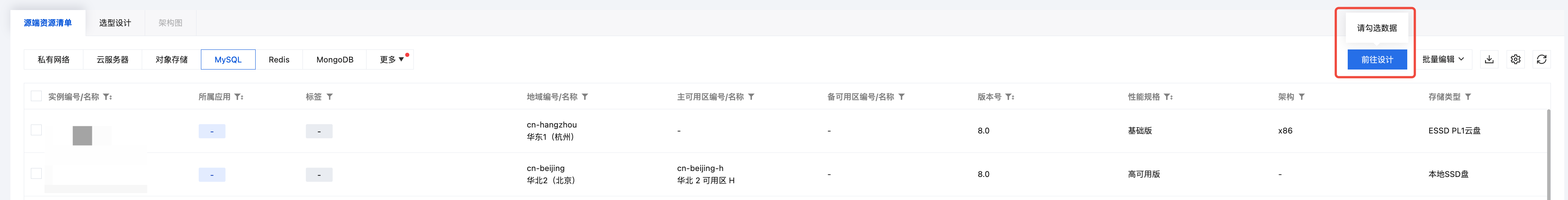 1. 在清单列表中可勾选需要进行选型推荐和询价的实例,单击前往设计可以将实例追加到调研分析的列表中。