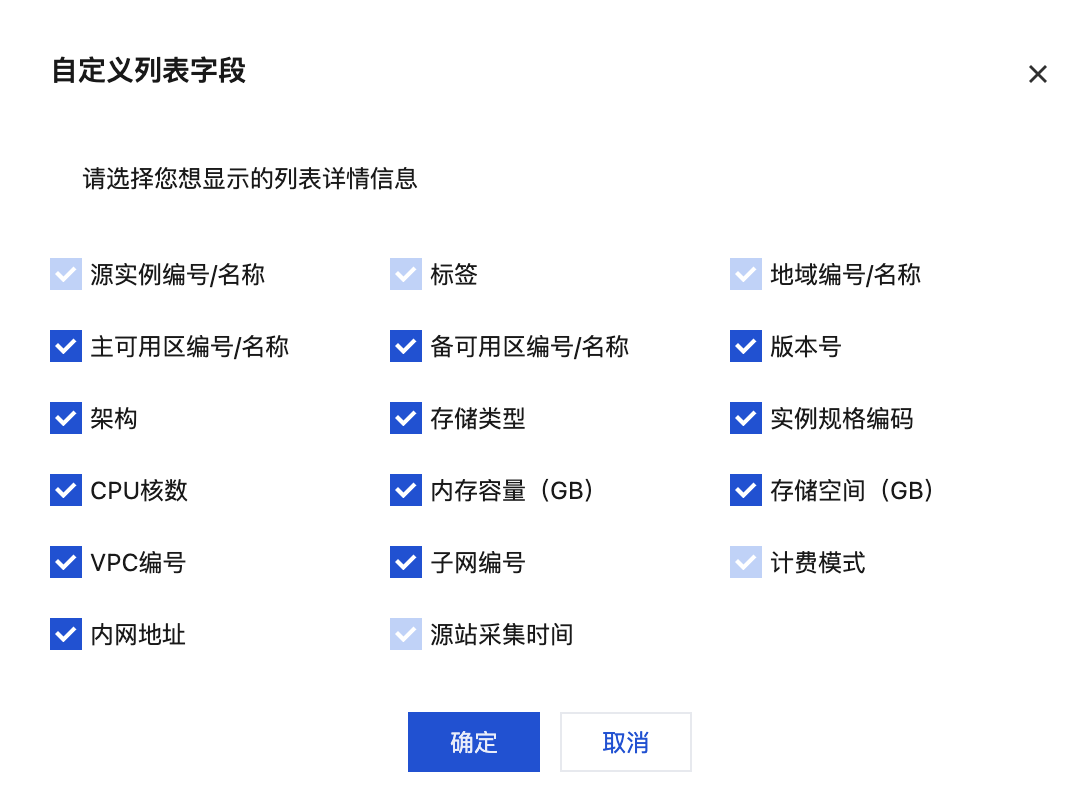 单击自定义列表字段,可选择在当前资源清单中需要显示的字段,其中源实例编号/名称、标签、计费模式、源站采集时间为必选项。
