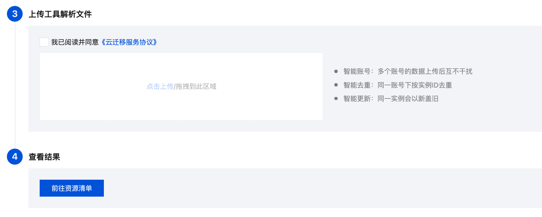 5. 进入 云迁移控制台,在 IDC 中选择工具调研,选择上一步中生成的