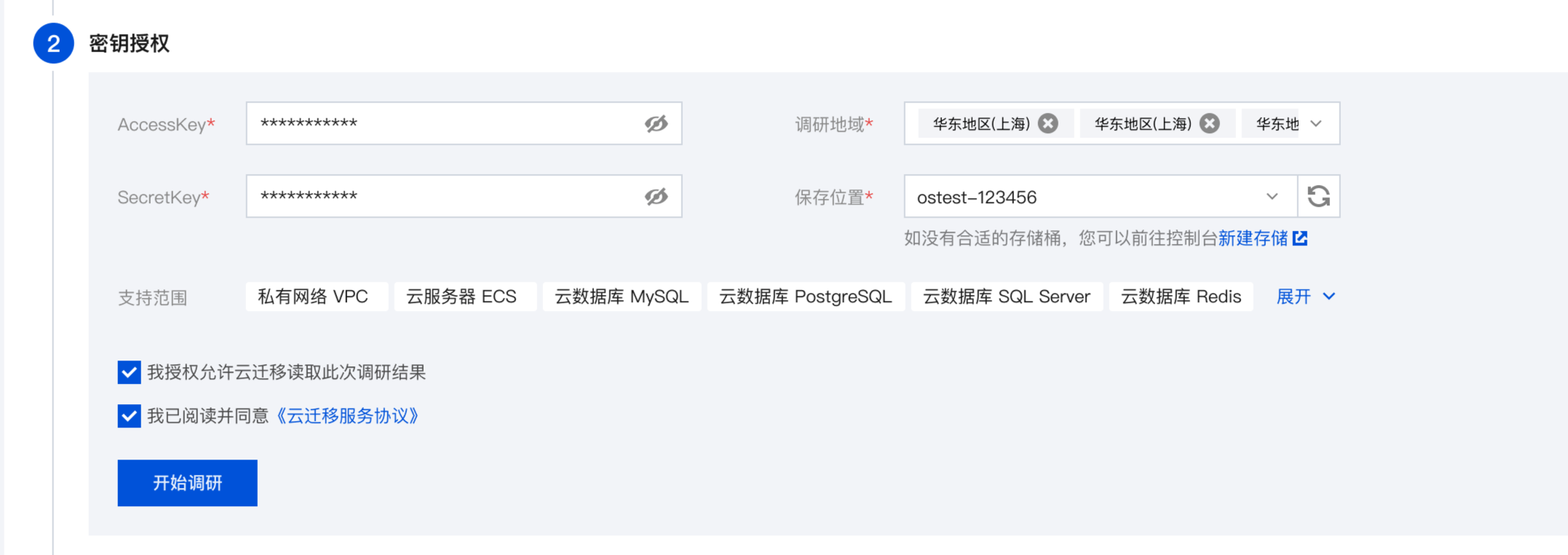 本文主要介绍,如何使用云迁移进行阿里云的在线调研。在线调研是通过授予云迁移一个阿里云只读权限的密钥,即可在线快速完成阿里云上多种资源的信息调研,调研内容主要为资源的类型、规格等。本操作指引仅供参考示意,旨在为用户提供清晰指南,部分素材来源于第三方公开信息,具体以第三方的相关页面为准。