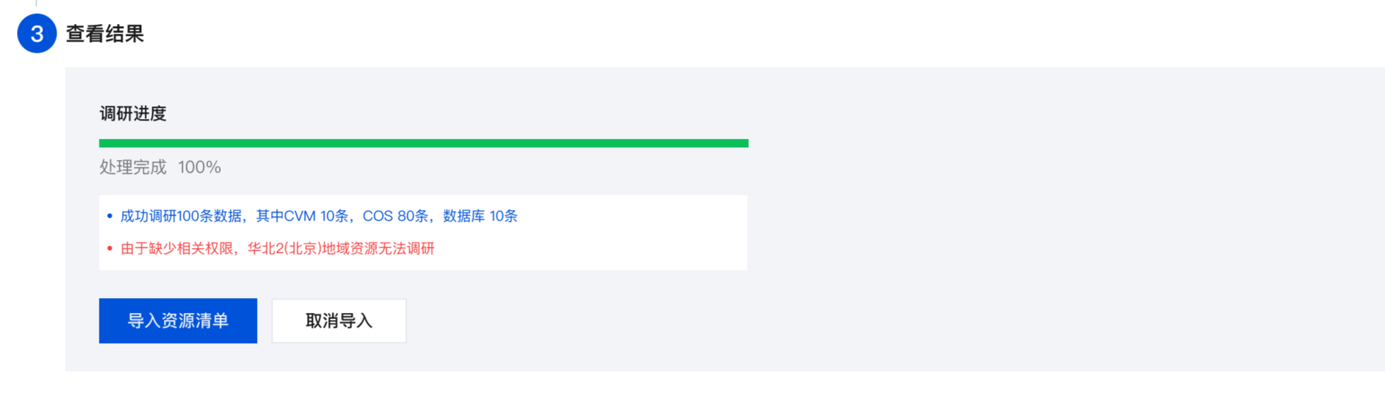 调研完成后展示调研资源数量,单击导入资源清单即可保存此次调研资源,并进入源端资源清单查看详细资源数据;若单击取消导入,则本次调研内容清空,可重新进行调研。