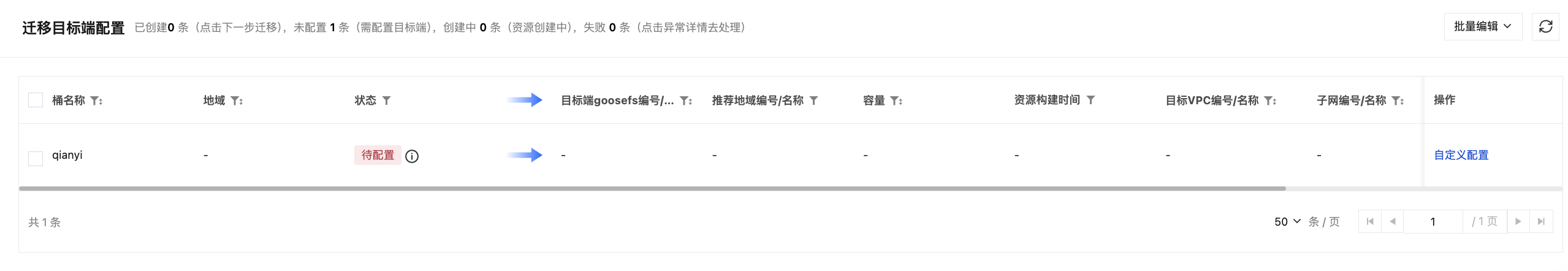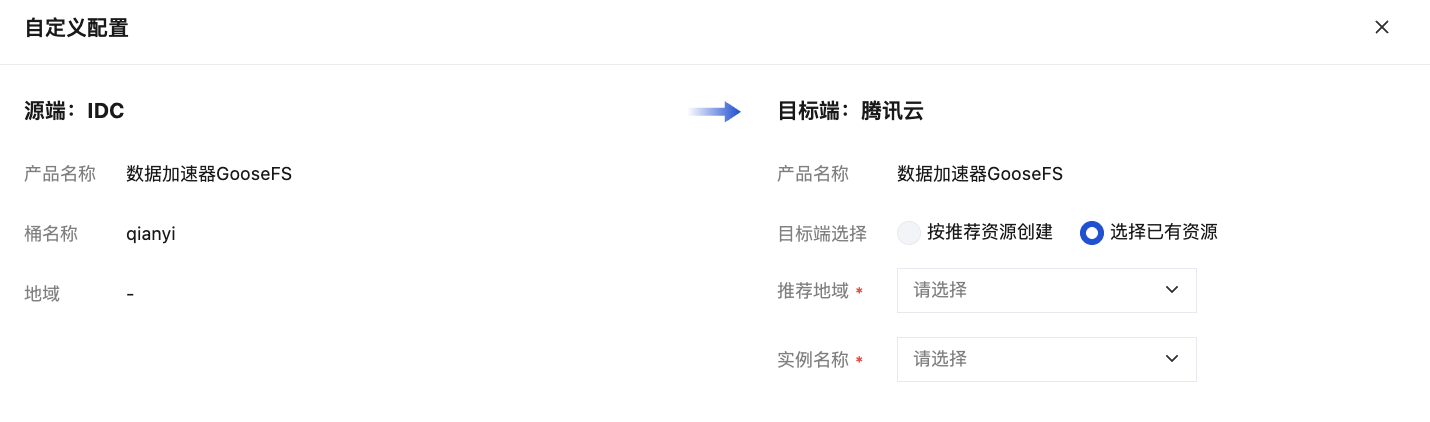 3. 在要迁移的资源操作列中单击自定义配置,在自定义配置中,选择迁移至已有资源,然后单击确定,单击下一步:配置启动迁移任务。