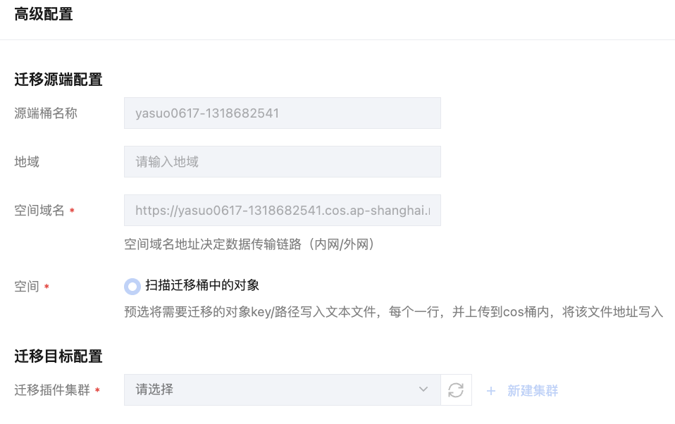 4. 勾选要迁移的数据,单击高级配置,填写空间域名(空间域名地址内网和外网属性决定数据传输链路)并选择迁移插件集群,然后单击确定。