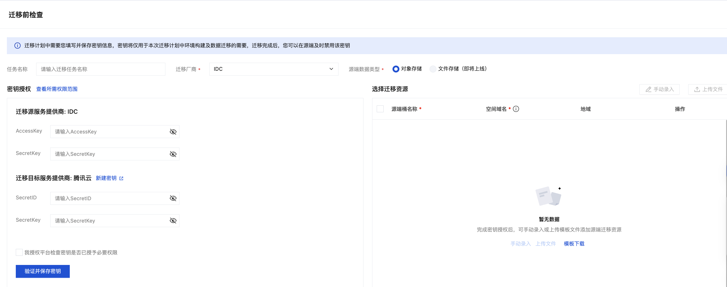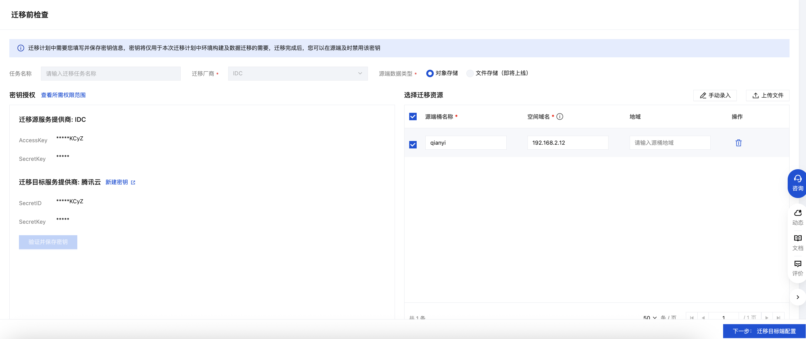 2. 密钥验证通过后,在选择迁移资源,可以通过“手工录入”和“上传文件”两种方式添加迁移,添加完迁移源信息后,单击下一步:迁移目标端配置。