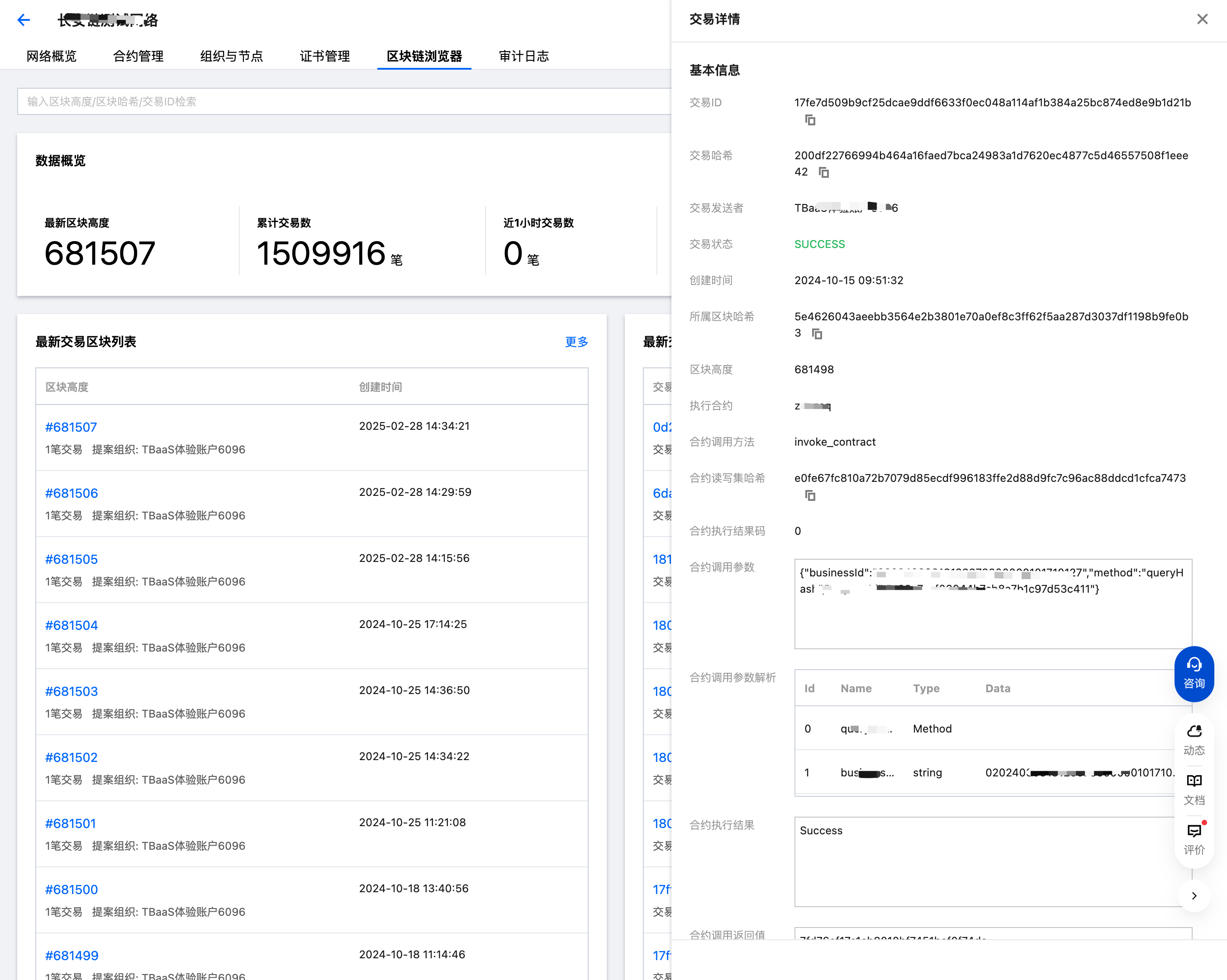 选择“区块链浏览器”页签进入浏览器页,即可实时检索或查看链上的数据。浏览器首页展示链上关键指标、交易趋势、最新的区块列表、最新的交易列表等信息。如下图所示: