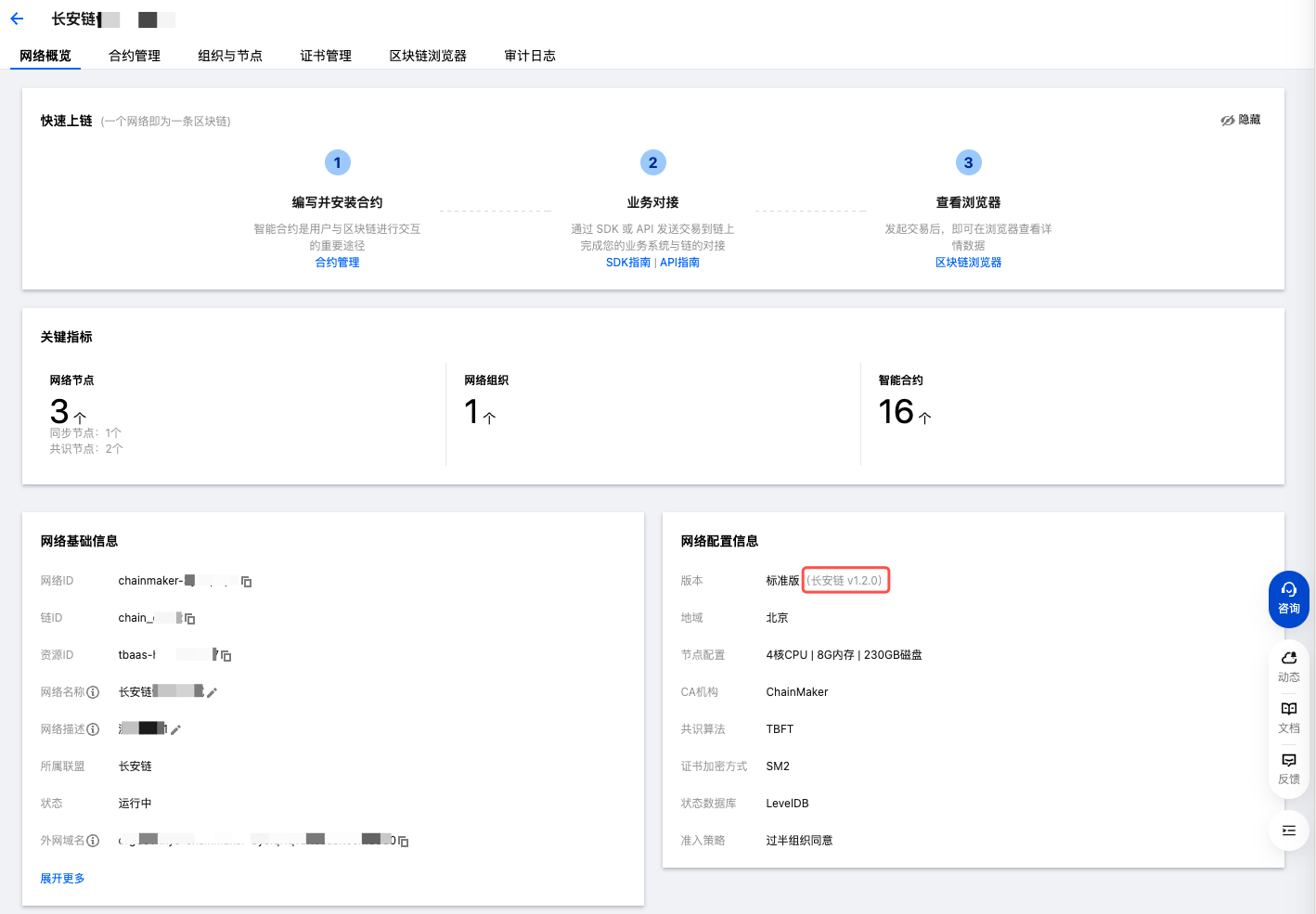 2. 选择左侧导航栏中的长安链 > 区块链网络,进入“区块链网络”页面。