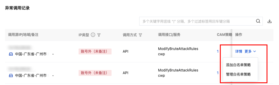 3. 在告警详情页面,选择所需调用源 IP,单击详情/更多。