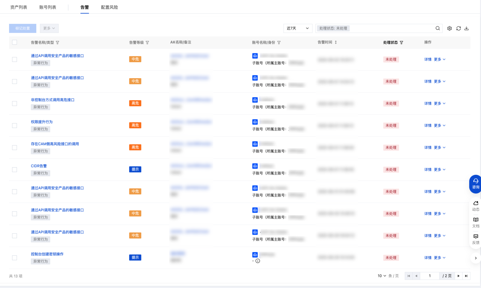 2. 在告警列表中,基于告警规则视角,查看告警内容(泄露、异常调用),关联 AK 与异常调用记录,并提供权限策略配置建议。