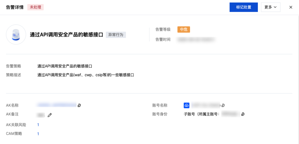 查看告警信息,告警信息包括:告警策略、策略描述、AK 名称、AK 备注、AK 关联风险、CAM 策略、账号名称以及账号身份。