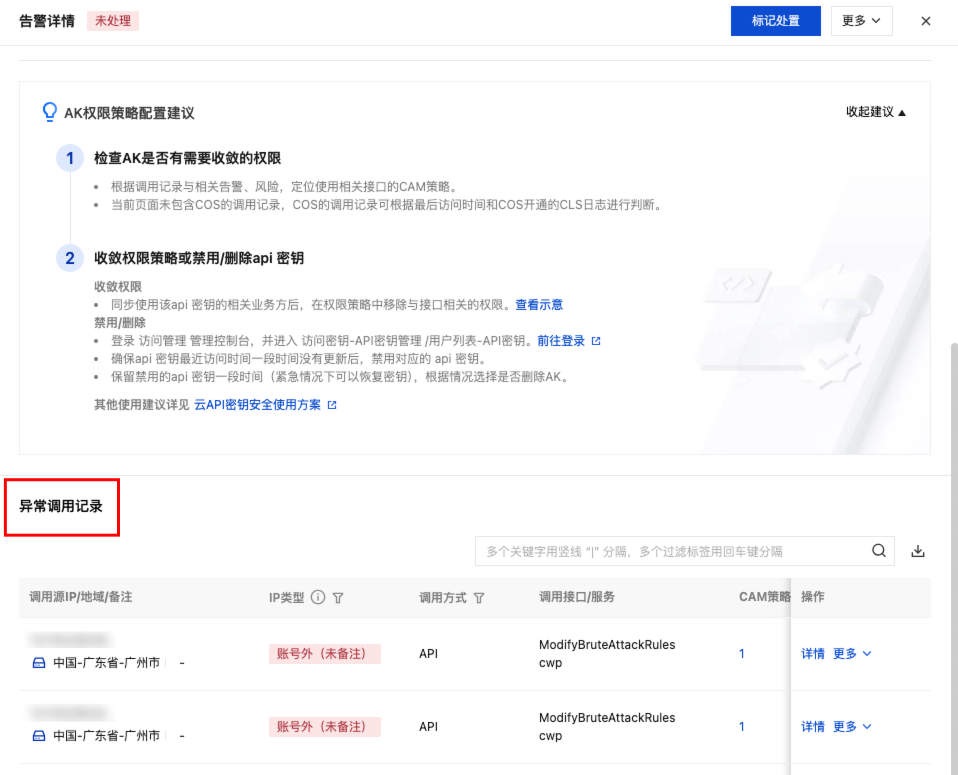 查看异常调用记录,包括调用该 AK 的 IP 地址、IP 类型、调用方式、服务名称、成功与失败的调用次数、首次/最近调用时间,以及相关的 CAM 策略。