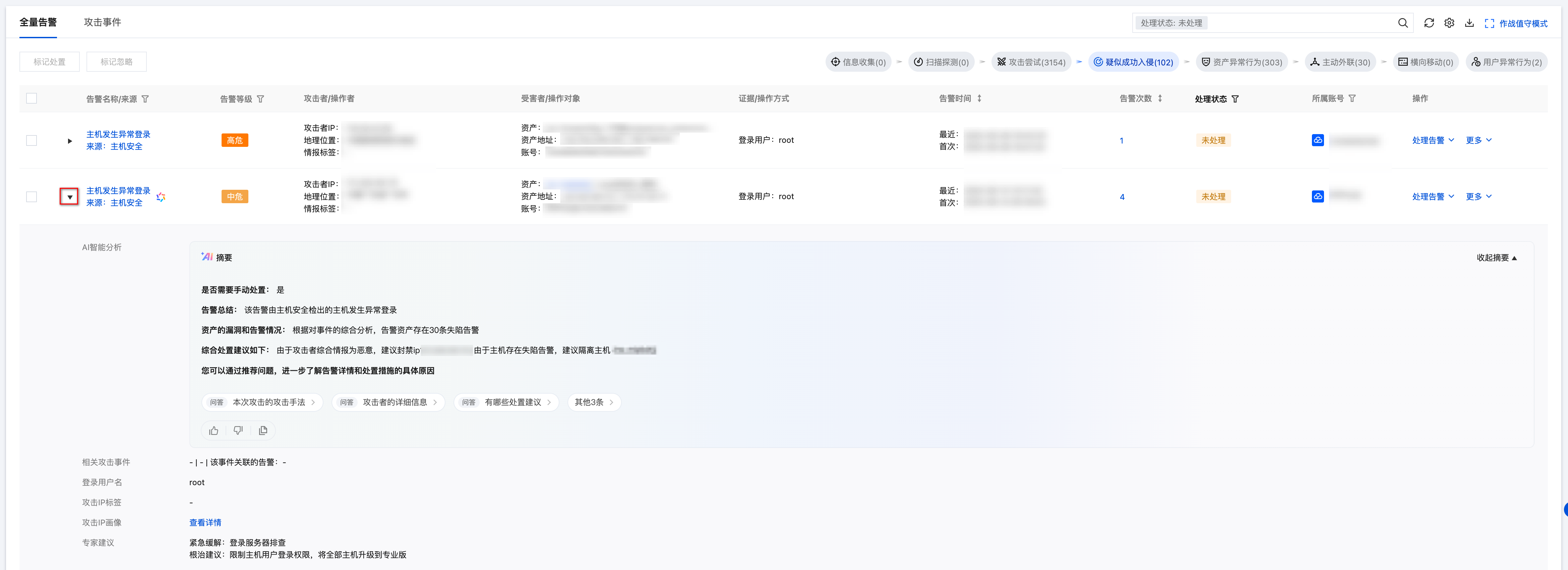 ,展开并查看告警详情,根据列表中提供的攻击者、受害者和证据定位攻击源头与受影响资产,并可参考 AI 智能分析提供的相关建议进行排查处置。