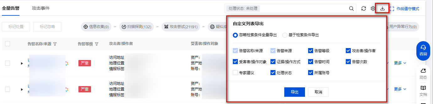 取消标记 | 当告警需要重新研判时,取消标记后处理状态将恢复为未处理。 | 当已处置或已忽略告警时,选择目标告警,可单击操作列的取消标记处置或取消标记忽略,进行取消操作。 |