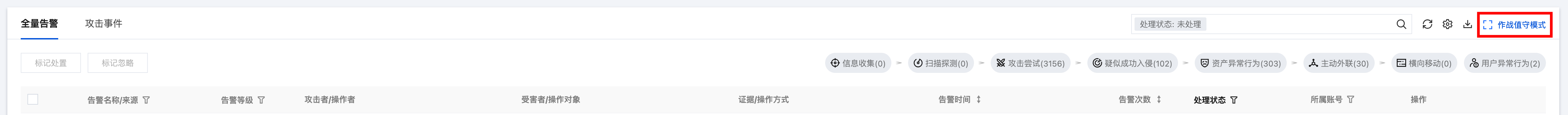2. 在全量告警页签,单击右上角的作战值守模式,启动作战值守模式。