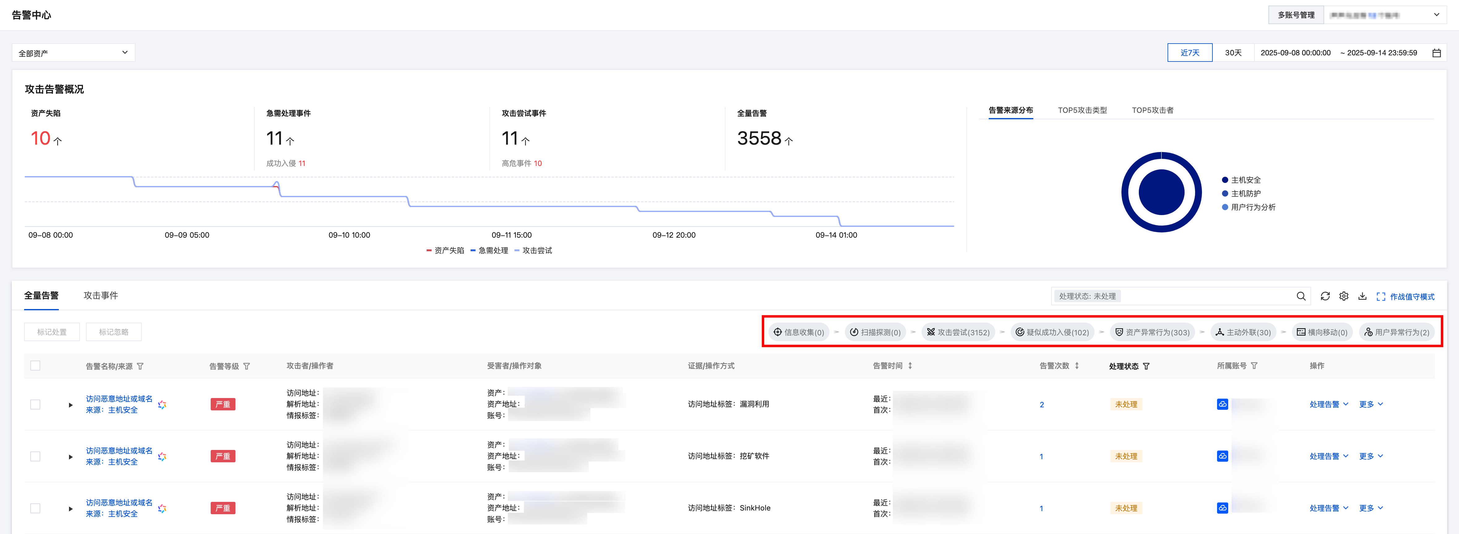 告警中心是一个集中监控和分析云上安全威胁的一体化功能,通过汇聚云安全中心、主机安全、容器安全、云防火墙和 Web 应用防火墙等来源的告警,基于 ATT&CK 框架进行告警关联分析,实现统一的安全威胁发现与管理,帮助用户快速发现和处置安全隐患。