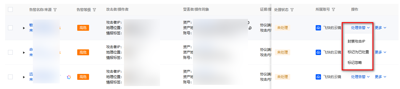 标为已处置 | 建议使用主机安全和云防火墙,对安全告警进行封禁回连地址、隔离资产等防御措施。防御处置后的告警可以标为已处置。 | 1. 支持单个或批量将告警状态标为已处置。 单个:选择目标告警,单击操作列的标记已处置。 批量:选择一个或多个告警,单击左上角的标记已处置。 2. 在确认窗口中,单击确定,即可将目标告警标记为已处置。 |