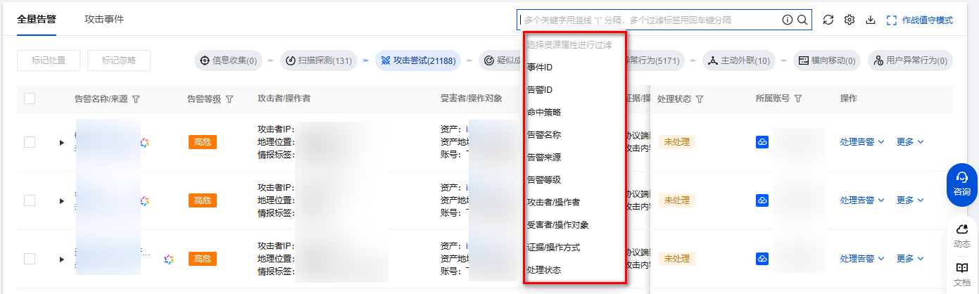 2. 在全量告警页签,单击筛选框,支持以关键字对告警进行筛选定位。