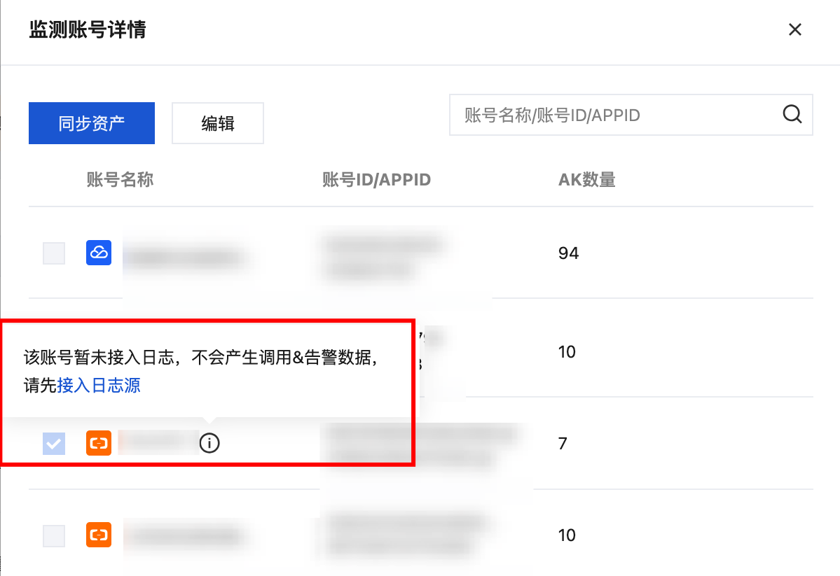取消勾选后,该账号下密钥后续不会继续监测(历史数据保留)。