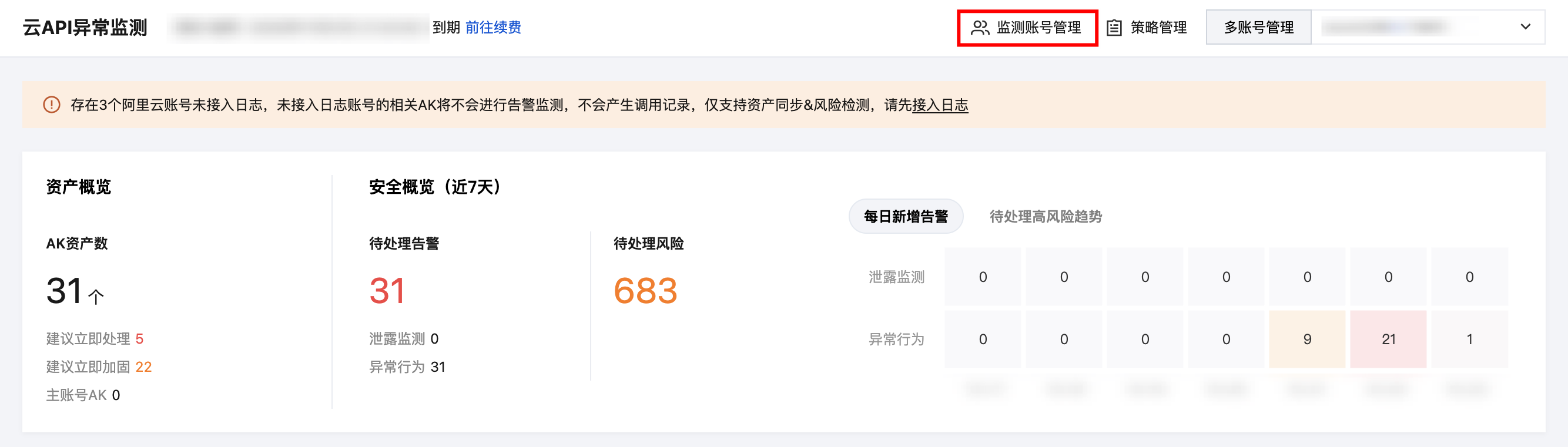 1. 在 云 API 异常监测页面,单击监测账号管理。
