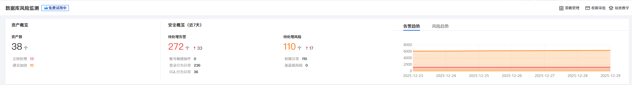 2. 在数据库风险监测页面,将显示当前资产概览、安全概览、告警趋势、风险趋势,您可以通过统计面板了解当前资产安全态势。