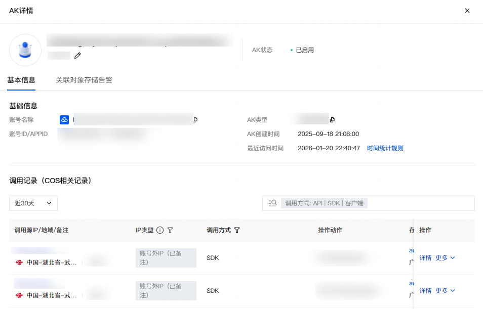 3. 在 AK 详情页面,将展示当前 AK 详情、AK 调用详情、AK 所关联的对象存储告警。