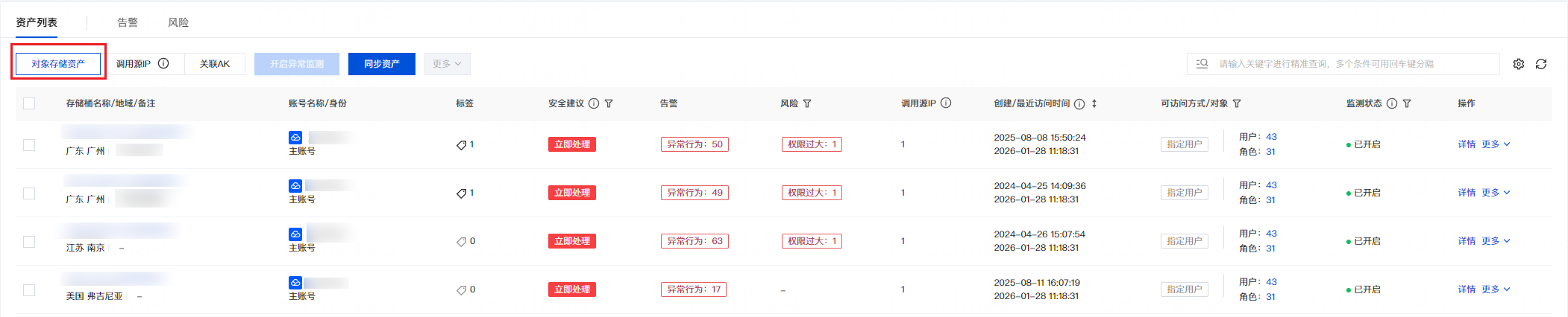 2. 在对象存储异常监测页面,单击资产列表 > 对象存储资产。