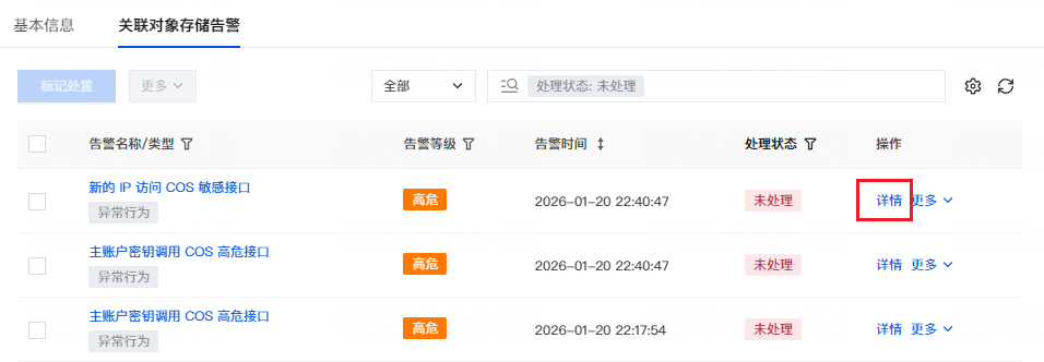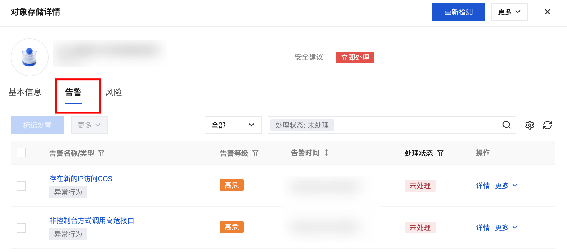 4. 在对象存储详情页面,单击告警,可查看当前对象存储资产的告警信息,默认展示未处理告警,单击详情可打开告警详情。