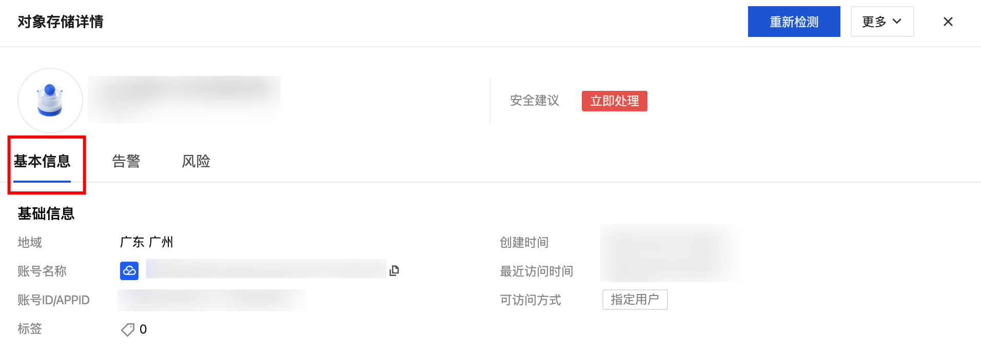 3. 在对象存储详情页面,单击基本信息,可查看存储桶基本信息,包括地域、账号名称、账号 ID/APPID、标签、创建时间、最近访问时间、可访问方式。