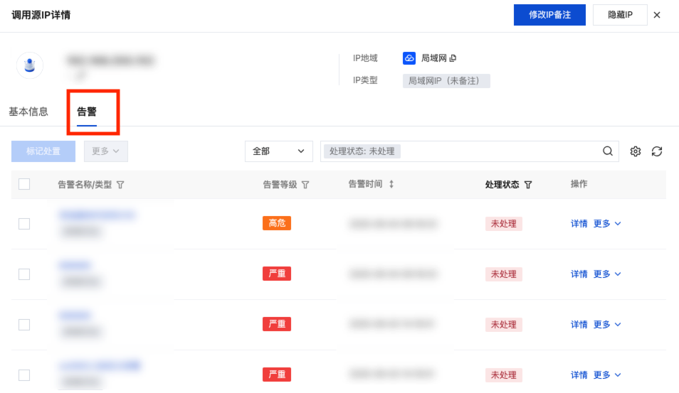 3. 在调用源 IP 详情页面,单击告警,可查看该 IP 相关告警信息,默认展示未处理告警,单击详情可查看告警详情。