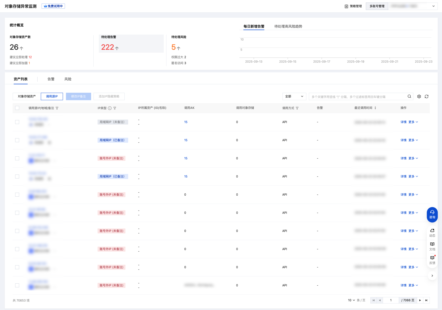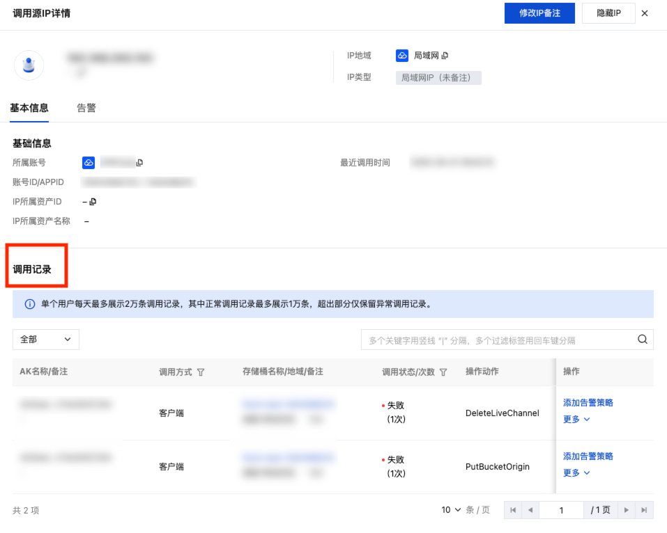 3. 在调用源 IP 页面中,基于调用源 IP 视角,可查看调用源 IP 信息、调用 AK、调用对象存储、关联告警、调用方式以及调用时间。