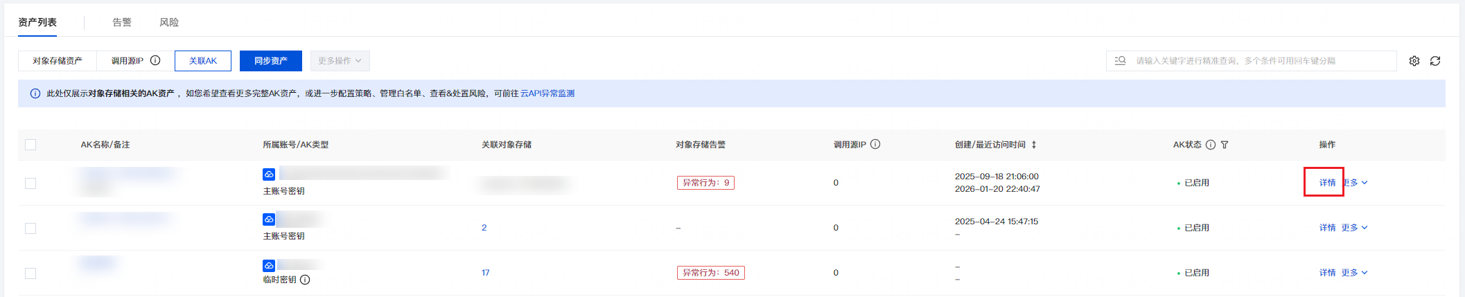 关联 AK 列表将展示对象存储相关的 AK 资产,可通过 AK 视角查看其关联的对象存储资产,以及所关联的对象存储资产告警详情。