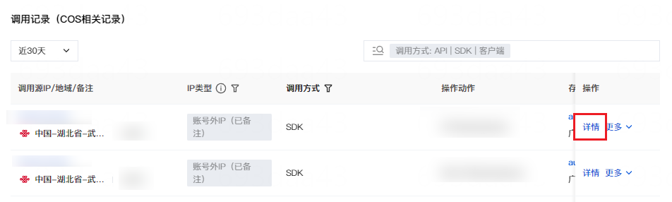 在调用源 IP 详情页面,单击基本信息 > 调用记录,可查看调用记录,包括 AK 名称/备注、调用方式、存储桶名称/地域/备注、调用状态/次数、操作动作、最近调用时间。