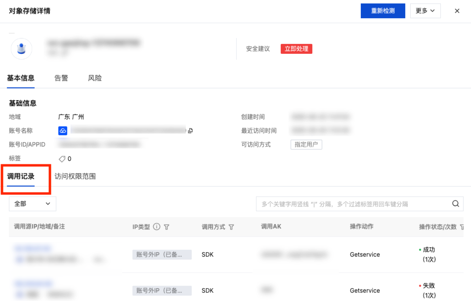 在对象存储详情页面,单击基本信息 > 调用记录,可查看当前对象存储资产的调用记录,包括:调用源 IP/地域/备注、IP 类型、调用方式、调用 AK、操作动作、操作状态/次数、首次/最近调用时间。