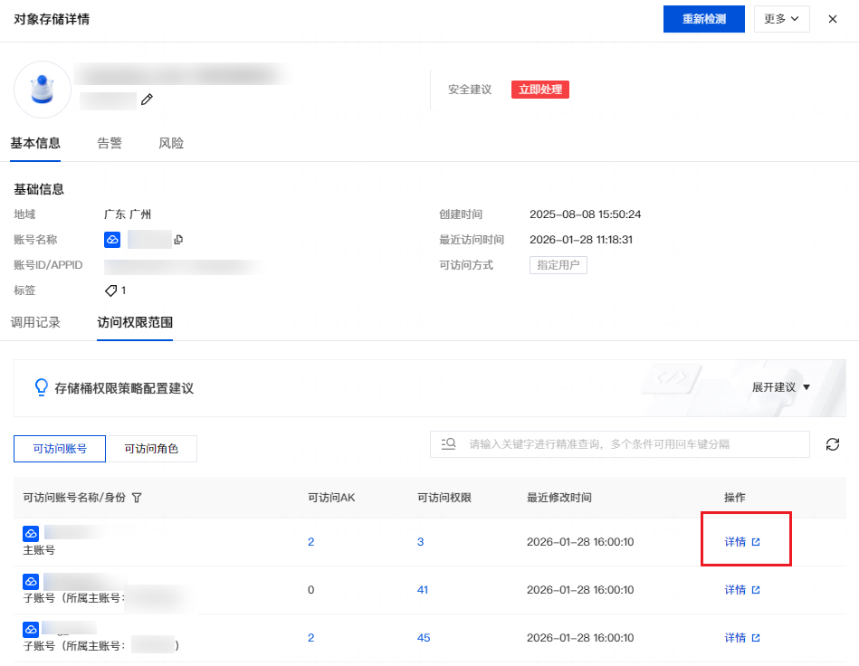 在对象存储详情页面,单击基本信息 > 访问权限范围,可通过访问账号和访问角色视角查看当前对象存储资产的访问权限范围。
