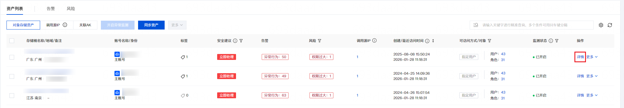 2. 在对象存储异常监测页面,单击资产列表 > 调用源 IP。