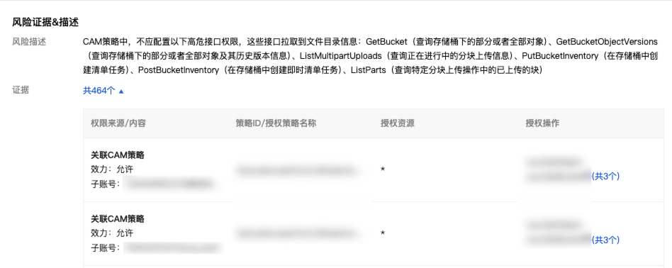 查看风险描述与证据,该风险详情的证据包括:权限来源/内容、策略 ID/授权策略名称、授权资源、授权操作。