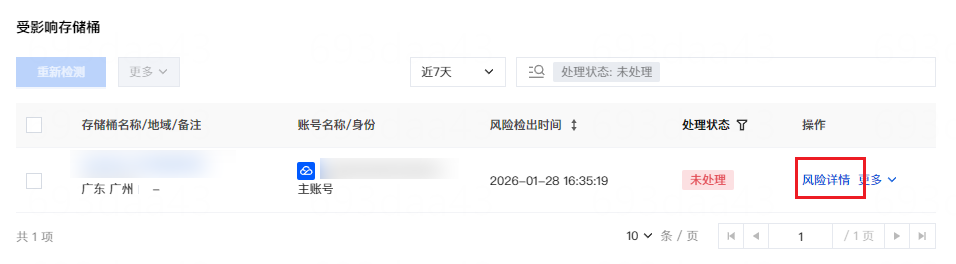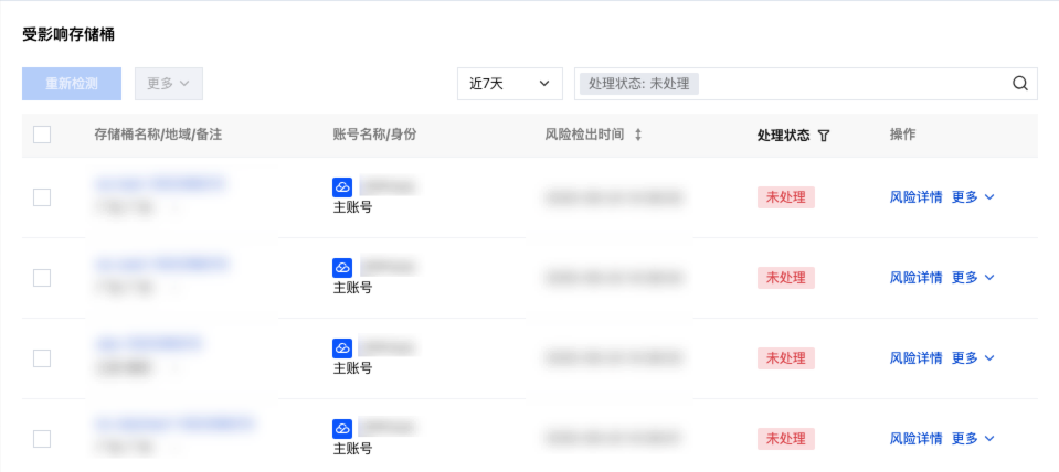 查看受影响存储桶列表,默认显示未处理风险的存储桶。